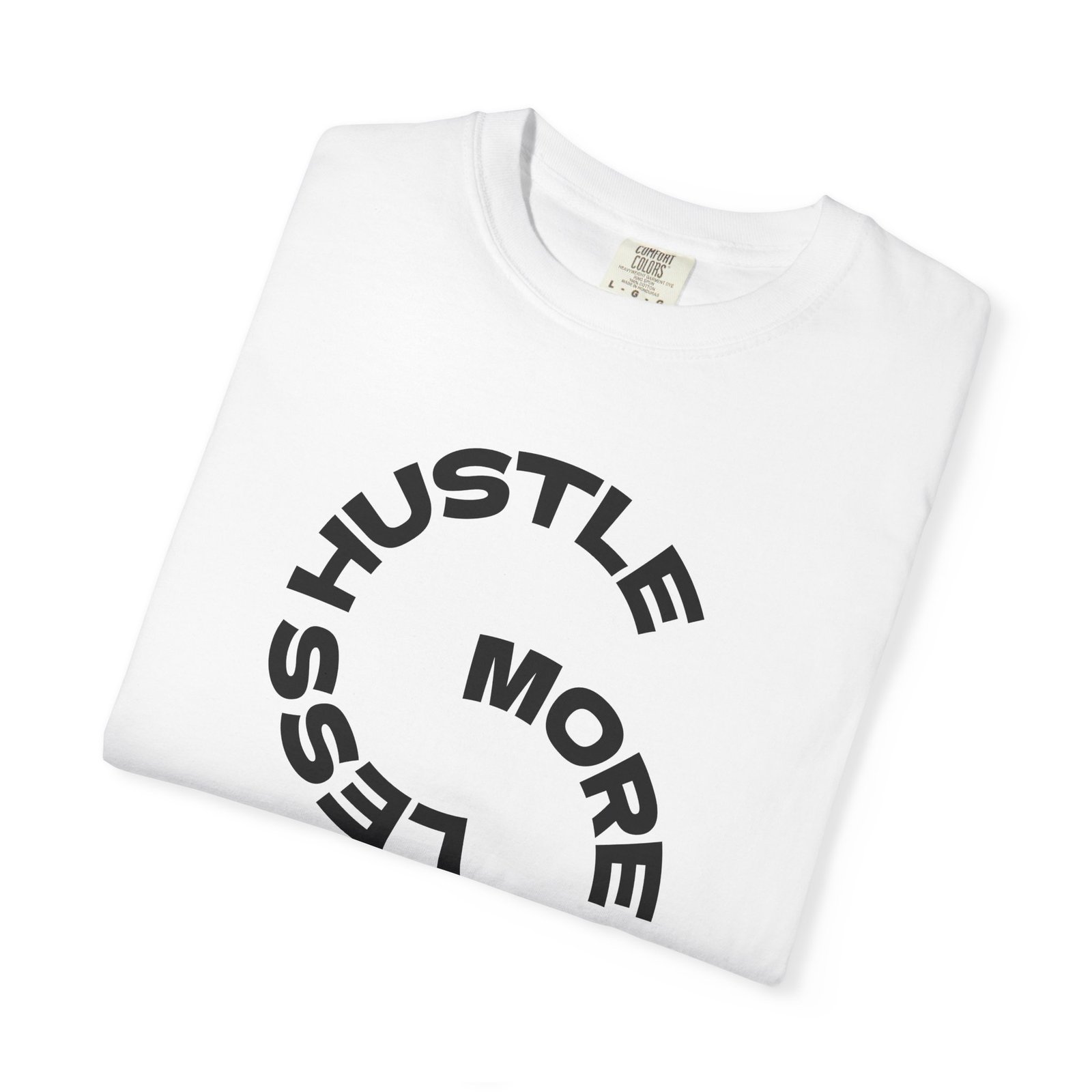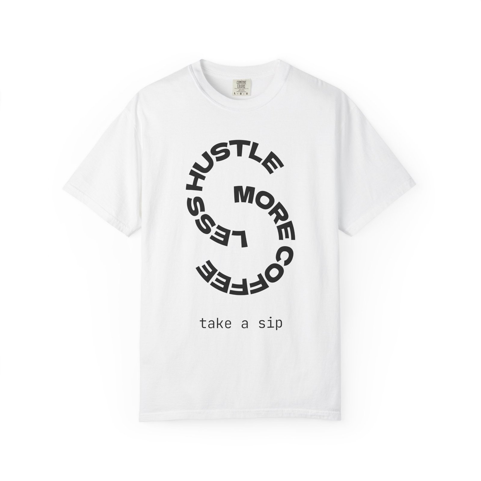 Lightweight grit with a soft, lived-in feel. This garment-dyed tee settles into your routine — the heavyweight cotton holds its shape while the relaxed cut moves with you through long mornings and late-night grind sessions. The minimalist circular print reads “Less Hustle More Coffee” with a small “take a sip” under it, a quiet nod to pausing for the little ritual that keeps focus steady. Wear it on commute runs, at the favorite café, or while sketching out plans at your kitchen table. The washed color and tubular knit give it a clean, vintage-ready look that layers easily under jackets or stands alone as your go-to casual statement.